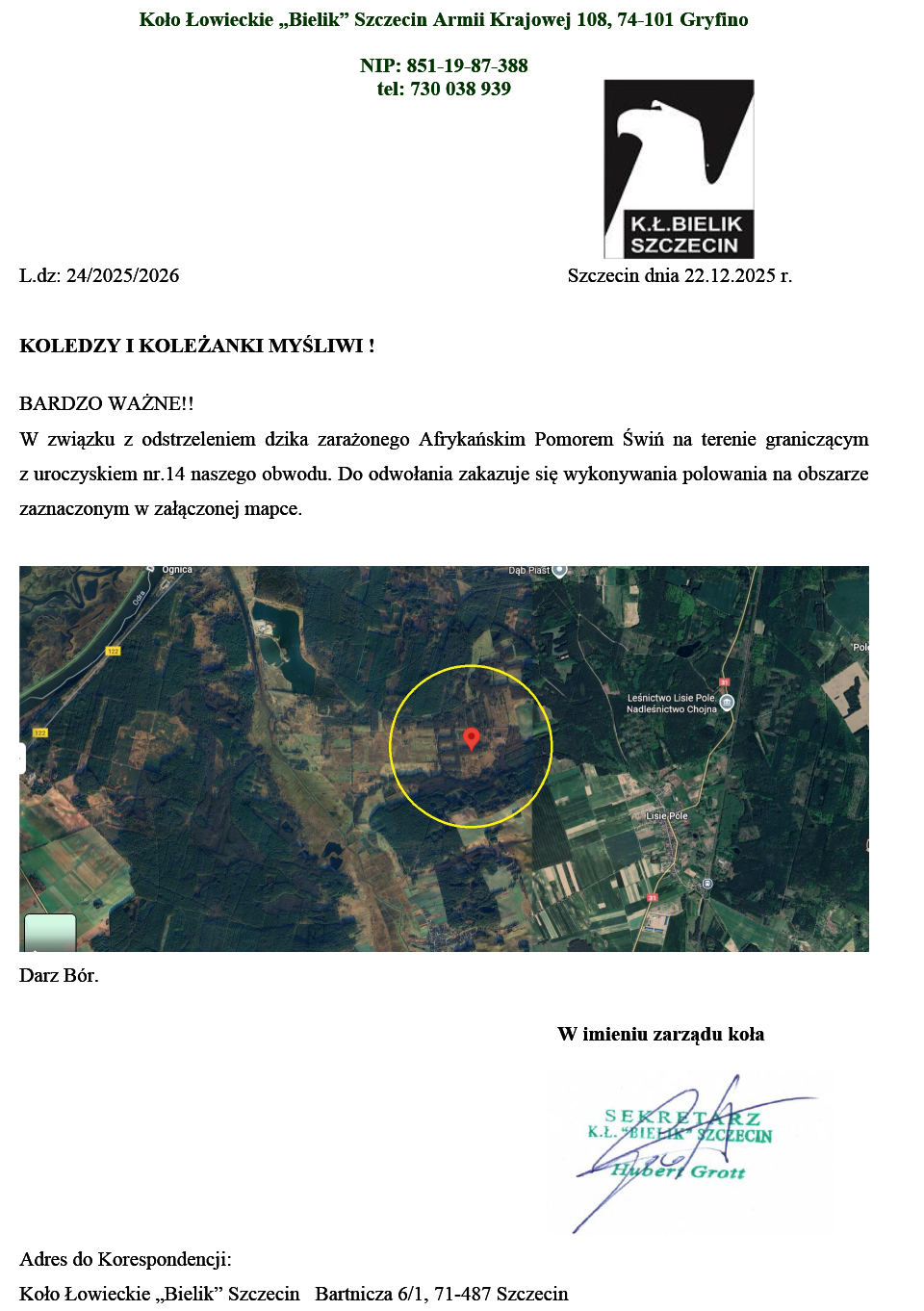 Koleżanki i koledzy poniżej informacja odnośnie zamknięcia chłodni w okresie Świąteczno - Noworocznym. Zarząd prosi o intensywny udział w polowaniach na dziki. Dzików jest dużo, a zmniejszenie liczebności pogłowia jest bardzo istotne punktu widzenia rozmiaru szkód.