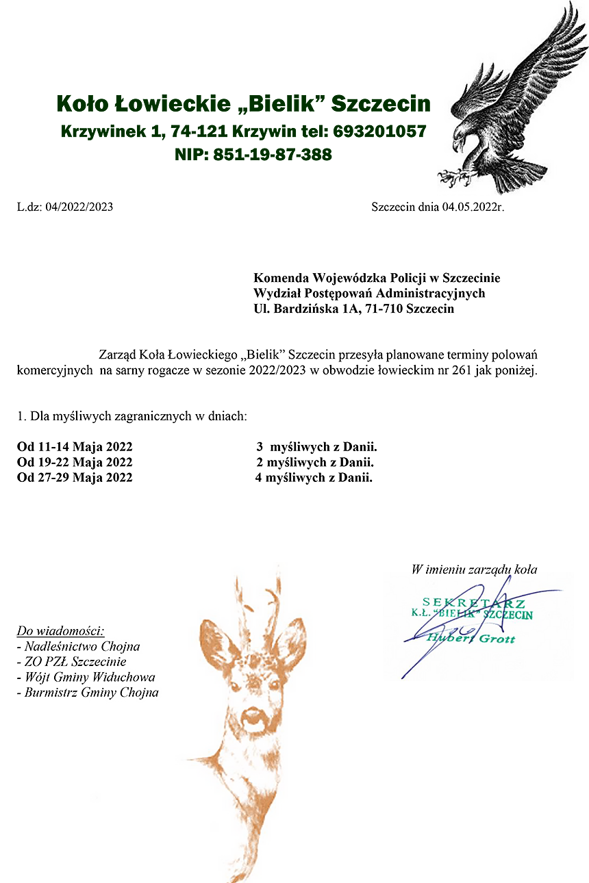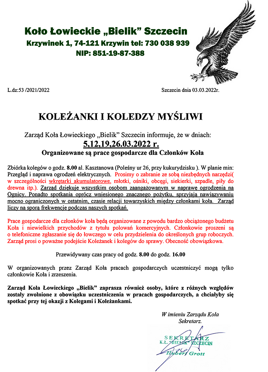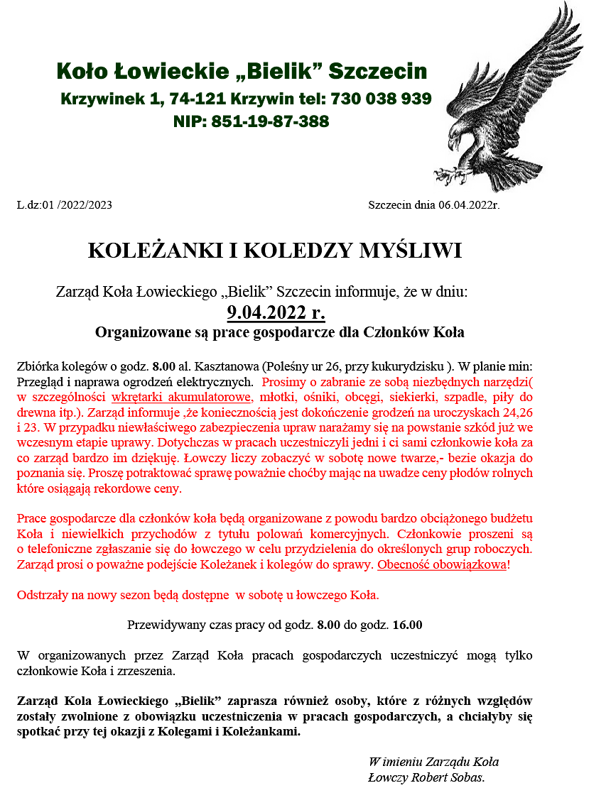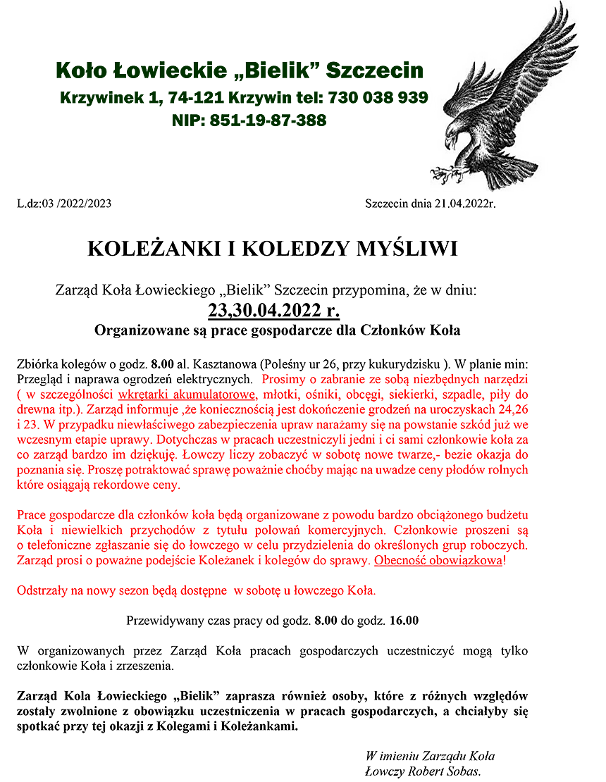 Koleżanki i Koledzy w związku z rozpoczętym nowym sezonem informuje, że odstrzały będą do odbioru u łowczego Koła Roberta Sobasa od 8 .04.2022. Opóźnienie wynika z przeciągających się formalności dotyczących zatwierdzania planów łowieckich na sezon 2022/2023.